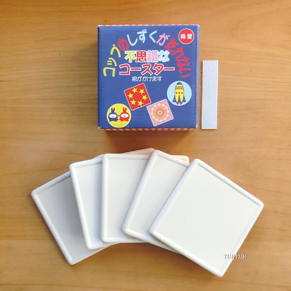 油性ペンで絵を描いて、オリジナルのコースターを作りましょう!冷たい飲み物を入れたコップから滴るしずくが、コースターの素焼き部分に吸収されると同時に蒸発して乾かすので、机が濡れません。
